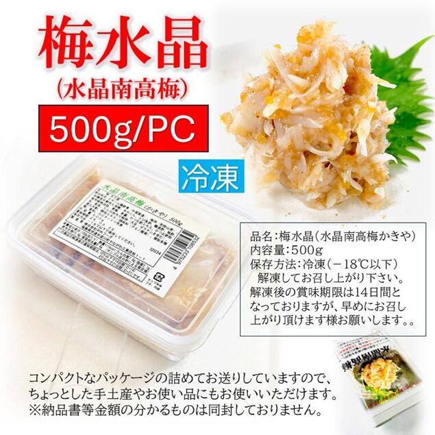 すっぱさとこりこりの食感がクセになる!和歌山県産の南高梅を使用した特選梅水晶500g。この梅水晶は居酒屋メニューでも大人気の逸品です。こりこりとした軟骨ととびっこをさっぱりとした紀州南高梅梅肉で和え、お皿に盛れば、簡単に本格的なおつまみ珍味が楽しめます。そのままでも美味しいですし、お酒のお供にもぴったりです。